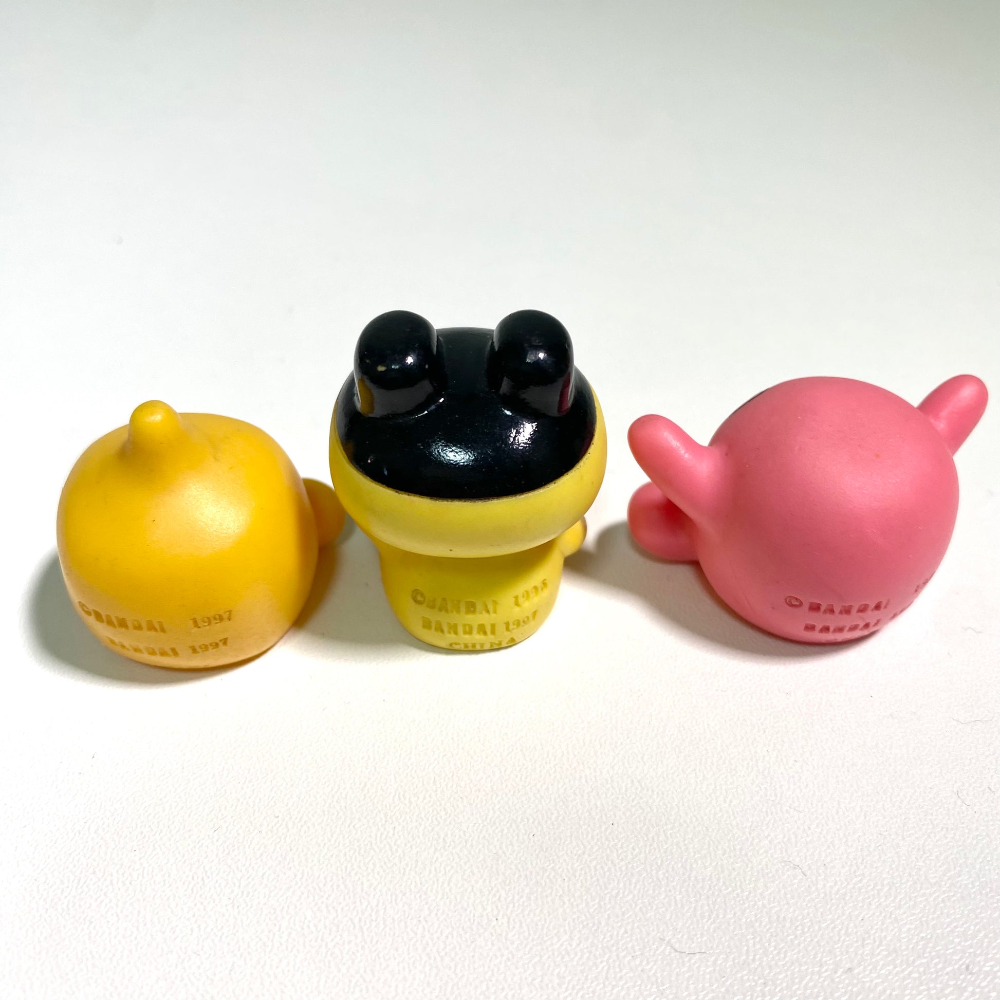 This is a retro Tamagotchi finger puppet figure set from 1997, featuring early character designs from the original Tamagotchi era.